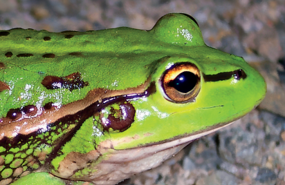 The Growling Grass Frog is a large, vibrantly coloured frog once common throughout south-eastern Australia. It is now endangered in Victoria due to widespread loss and fragmentation of its wetland habitats. It is a strong indicator species for healthy, well-connected wetland systems.