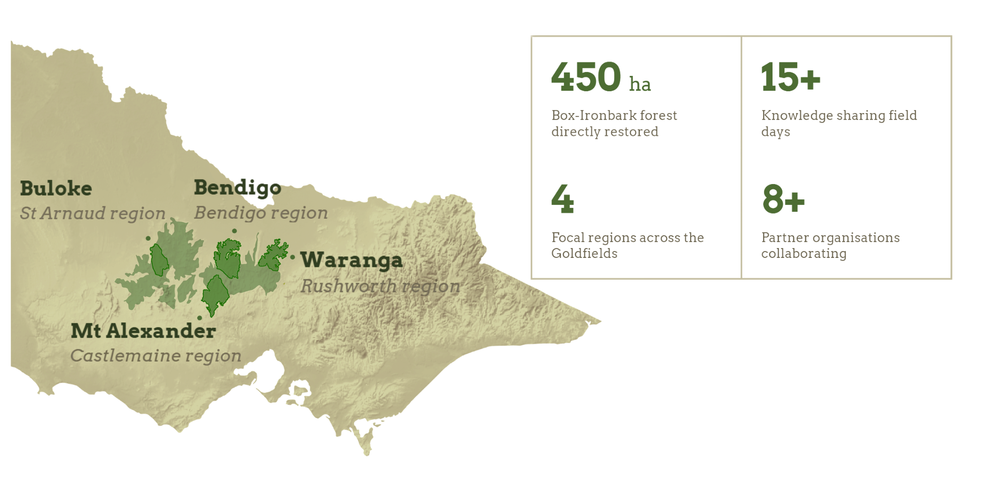 The Goldfields Forest Restoration Project on Dja Dja Wurrung and Taungurung Country is a collaboration with Trust for Nature, City of Greater Bendigo, Buloke Northern Grampians Landcare Network, Waranga Catchment Landcare Collective, Connecting Country, Bush Heritage Australia, La Trobe University and Tailored Restoration Ecology and Conservation Land Services (TREC).